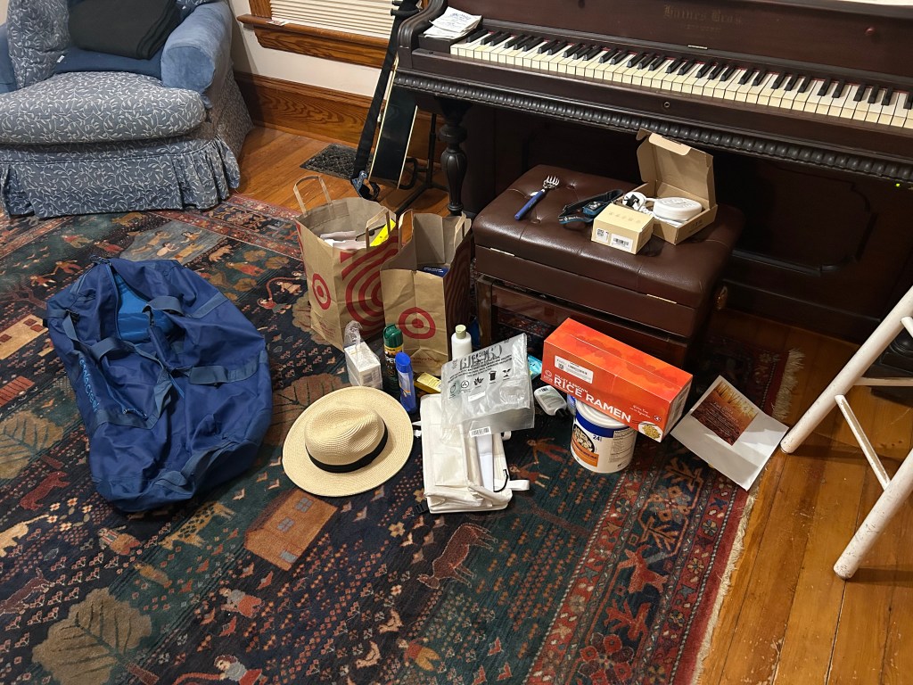 My living room is full of stuff that I need to bring for a 3 month stay on a ship and then a safari for 10 days afterwards. This means I need a 3+ month supply of the supplements and medications that I take/use, a 3+ month supply of contact lens solutions, soap, shampoo/conditioner, lotion, sunscreen, bug repellent as well as things like an extra towel, extra blanket, travel guitar and music, capo, picks, books to read, paper and writing utensils, headphone, computer, phone, clothing, etc, etc.